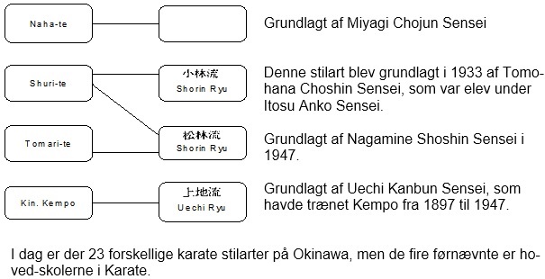Som det kan ses, er der 3 forskellige varianter af “TE” på Okinawa: TOMARI-TE. SHURI-TE og NAHA-TE, som ganske enkelt er opkaldt efter den by, stilarten stammer fra. Samlet blev de benævnt “Todei” eller “Karate”, med japanske skrifttegn, som betyder “Kina Hånd”. Det er vigtigt at påpege, at de 3 stilarter er nært beslægtede og kun er forskellige i fortolkningen - ikke i selve indholdet. Alle Okinawa’s stilarter er - bortset fra nogle hårfine forskelligheder - en og samme kampkunst, der anvender de samme teknikker og har samme mål. Det afspejles i den kendsgerning, at stilarterne hver især har samme formål: “Selvforsvar” og de enkelte grene imellem hersker der respekt og venskab - ikke fjendtligheder.